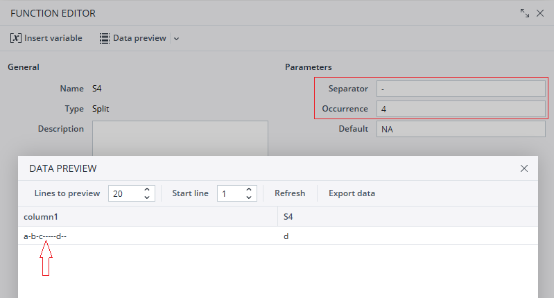 For example, in the function below, occurrence is set to 4. In the data set (indicated with an arrow), there is a series of separators with no values between them. In this scenario, these separators will be skipped until the next non-empty field, which is "d".