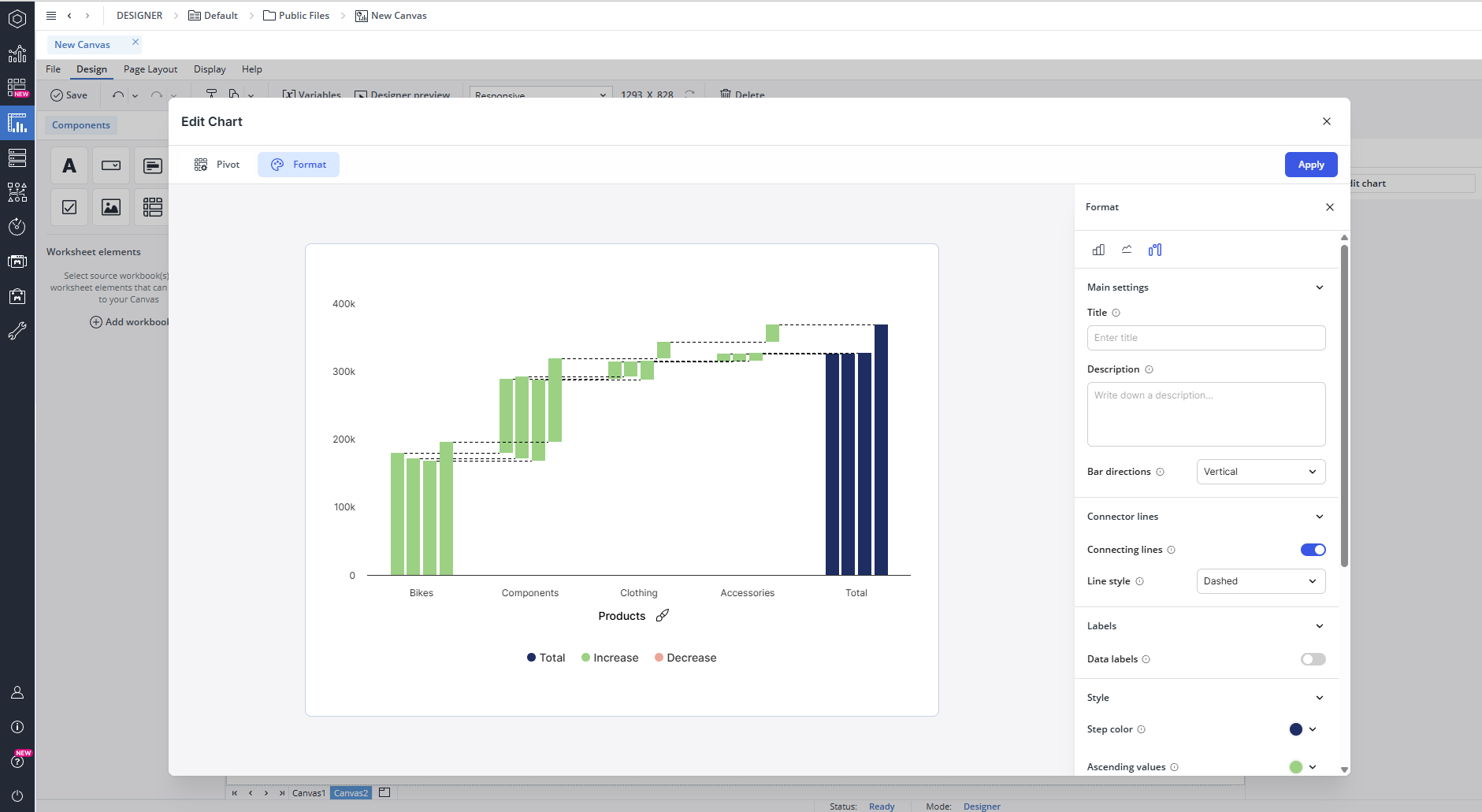 When you drag and drop a chart onto your Canvas, a Chart Creation dialog appears. The Bar chart is selected by default. To switch to a waterfall chart, go to Format and select the Line chart. Click Pivot to return to the chart configuration dialog.