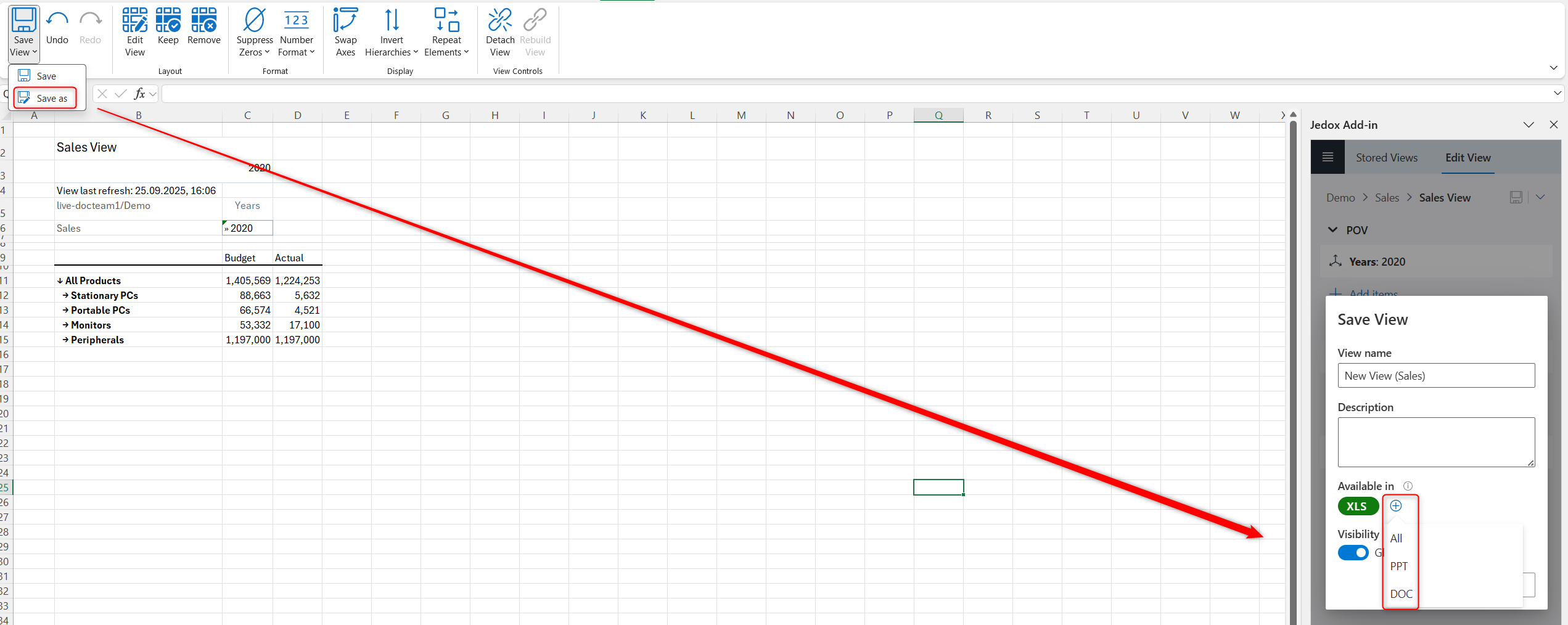 Note that the Views must have been previously saved as type PowerPoint (PPT) or Word (DOC) from the Add-in for Excel 365, in order for them to be accordingly available.