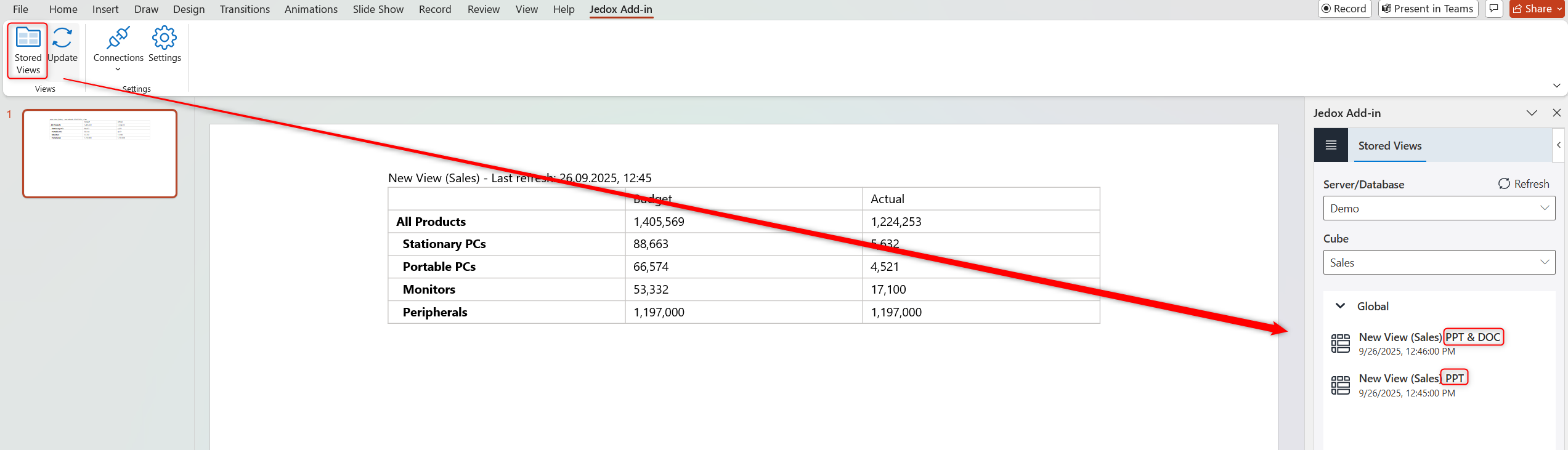 With the Jedox Add-in for PowerPoint & Word 365, you can access, display, and update Jedox Views in tabular form directly in Microsoft PowerPoint or Word. It uses the same language that is set for the Add-in in Excel 365.