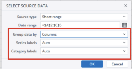 Note: After creating the SUCCESS chart, you can modify its source data by right-clicking the chart and choosing “Select source data.” However, unlike dynamic charts, the ‘Group data by’ option in this dialog does not affect the SUCCESS chart.