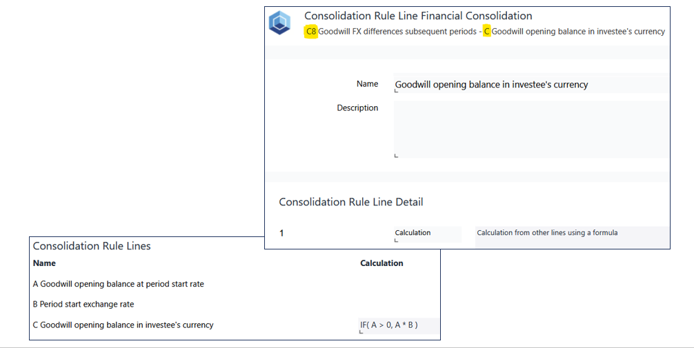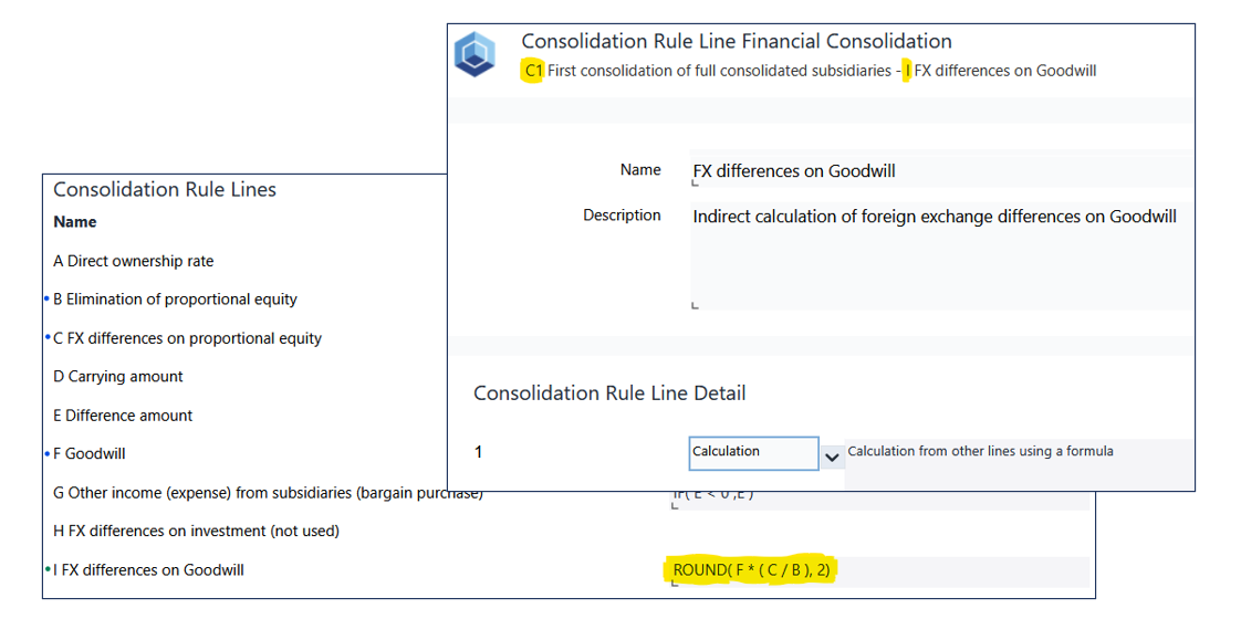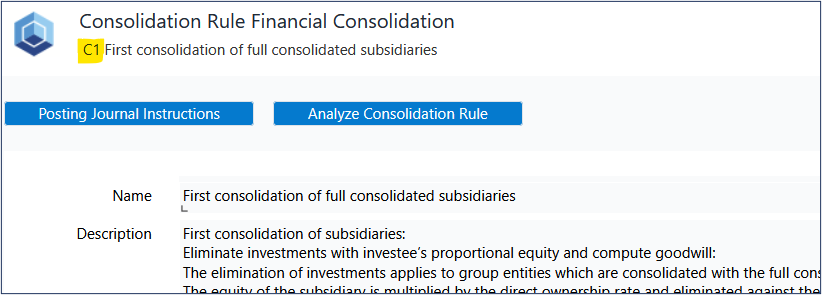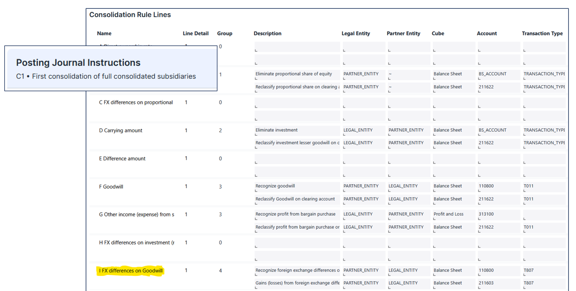This Consolidation Rule C1 includes additional Consolidation Rule Lines C and I, which are designed to calculate FX differences on goodwill. In addition, there are Posting Journal Instructions on Consolidation Rule Line I to ensure that the corresponding journal entries are posted during the execution of the Consolidation Procedure.