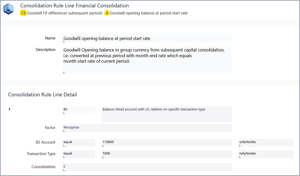 The automatic recognition of foreign currency differences on goodwill described in this article is limited to fully consolidated subsidiaries; entities consolidated at equity or using the proportional method are not included in the sample logic. In addition, subsequent adjustments to goodwill, such as those arising from impairment tests, are not handled by the automated processing provided in these sample Consolidation Rules. The recognition of foreign exchange differences in other comprehensive income (OCI) is also currently out of scope and has not yet been implemented in the sample configuration. As these rules form part of the sample configuration, they are intended only as illustrative examples. Each customer must configure their own Consolidation Rules to reflect their specific requirements, including the applied accounting standards and chart of accounts.