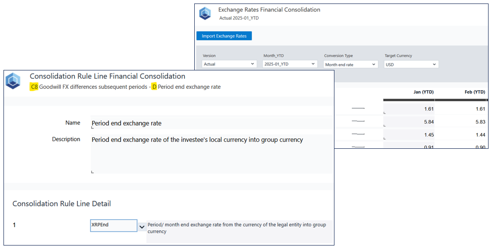 The sample data Consolidation Rule C1 has been extended to account for foreign exchange (FX) differences on goodwill for the first consolidation period.