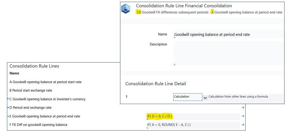 Consolidation Rule Line E calculates the goodwill opening balance converted at the period-end exchange rate. This calculation draws directly on the results of Consolidation Rule Lines C and D, which provide the necessary local-currency balance and the applicable exchange rate.