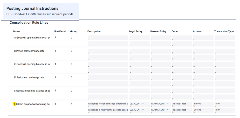 The Posting Journal Instructions for recognizing FX differences on goodwill in subsequent consolidation periods are defined exclusively on Consolidation Rule Line F. These instructions automatically generate the required journal entries, posting the foreign exchange differences to the Goodwill account and the Reserve of exchange differences on translation. The resulting entries are recorded on the legal entity, rather than the partner entity, and use transaction type T807 (FXDiff, historic).