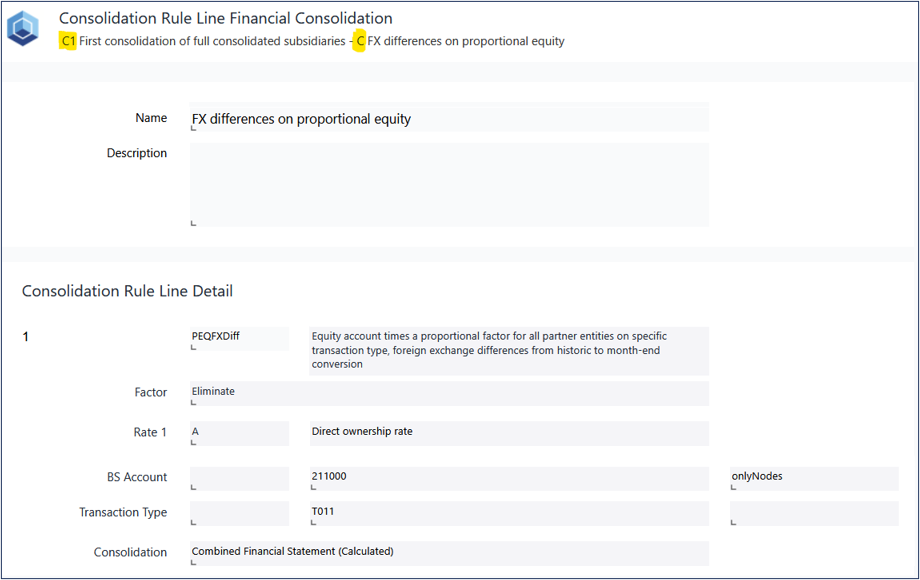 The Consolidation Rule for Line C calculates the foreign exchange (FX) differences for proportional equity. Its configuration closely follows that of Line B, but with specific adjustments to the Consolidation Function (Fact Selector), the Account Mode, and the applicable consolidation level to accommodate the requirements of this calculation. In this context, the PEQFXDiff Consolidation Function is used to determine the FX differences for the selected proportional equity.
