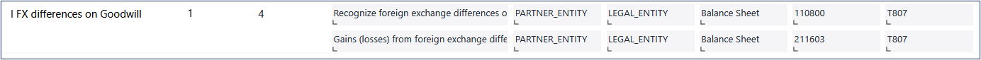 The Posting Journal Instructions defined for Consolidation Rule Line I ensure that the calculated FX differences on goodwill are automatically recorded during the execution of the consolidation procedure. These instructions generate the required journal entries, posting the foreign exchange differences to both the goodwill account and the Reserve of exchange differences on translation. The resulting postings are applied to the partner entity (rather than the legal entity) and use transaction type T807 (FXDiff, historic).