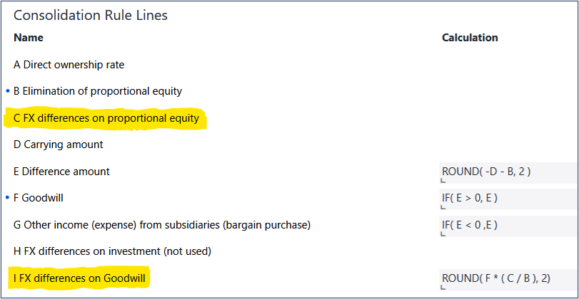 The Consolidation Rule for Line I calculates the foreign exchange (FX) differences related to goodwill by applying the ratio of the FX difference on proportional equity to the proportional equity itself and multiplying this ratio by the value of goodwill. To arrive at this result, the calculation draws on figures produced by other Consolidation Rule Lines.