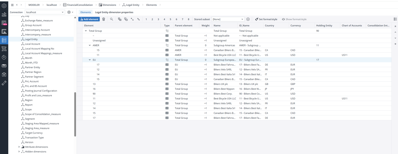 The Legal Entity dimension defines the individual companies within a corporate group that prepare their own financial statements. Each legal entity represents a distinct organizational unit included in the consolidation process. All entities must ultimately roll up to the Total Group element—either directly or through intermediate levels such as regional or functional subgroups (e.g., EU or AMER). The number of legal entity elements in this dimension determines how many entities are included in the overall consolidation scope.