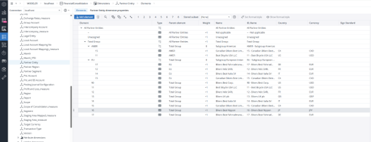 The Partner Entity dimension defines the intercompany relationships within the group, capturing transactions between affiliated legal entities. All internal partner entities ultimately roll up to the Total Group element—either directly or through intermediate subgroups such as EU or AMER (as shown in the sample data). The root element of this dimension is All Partner Entities, which serves as the consolidated parent for all intercompany partners.