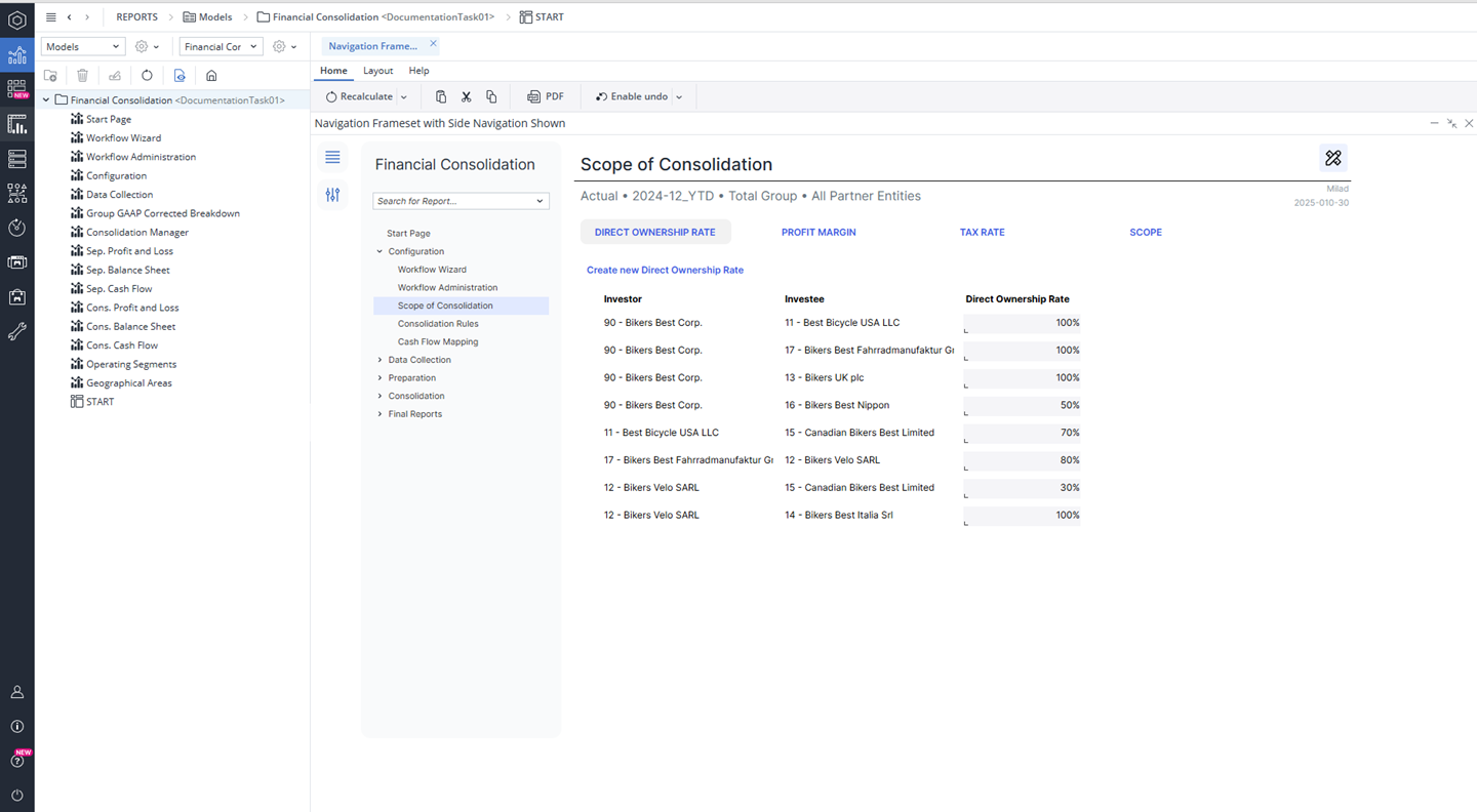 Once all three dimensions are filled out, you can proceed to the Financial Consolidation Scope of Consolidation . In this section, you can add a direct ownership rate or modify it, create new profit margin relations to capture tax rates for intercompany transactions, and specify the consolidation method within the scope screen.