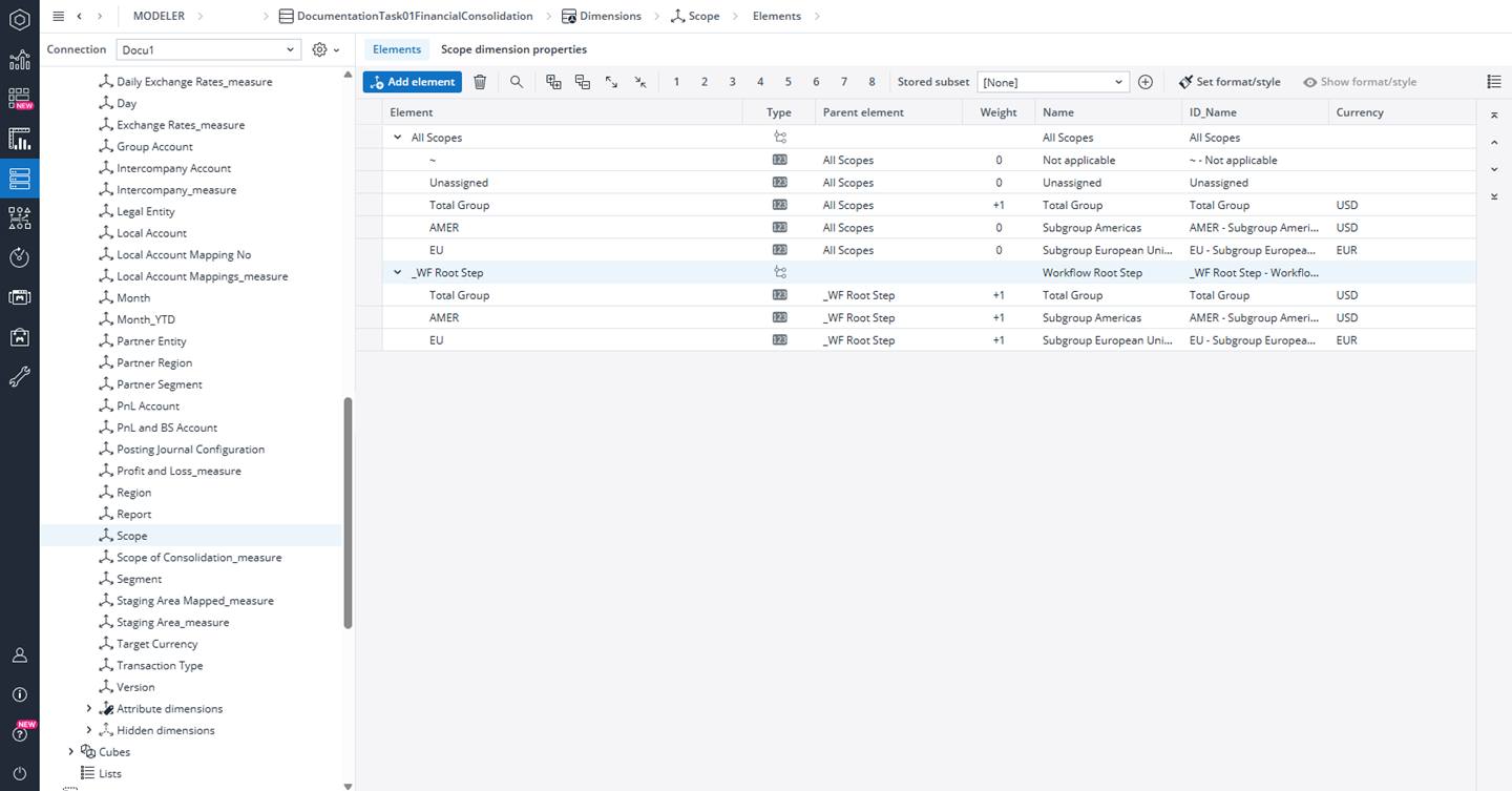 The Scope dimension includes all target elements for financial consolidation in a flat list, covering the Total Group and subgroup elements such as AMER and EU.
