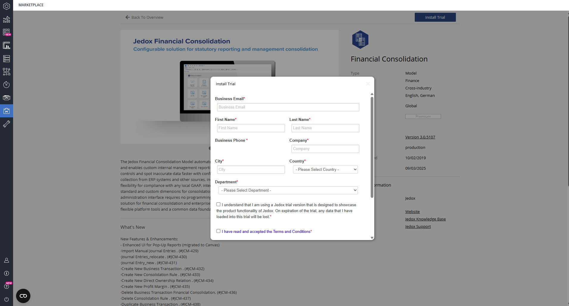 In Jedox Web, open the Marketplace panel. Find and select the Jedox Financial Consolidation model. Select "Install Trial" for the Financial Consolidation model.