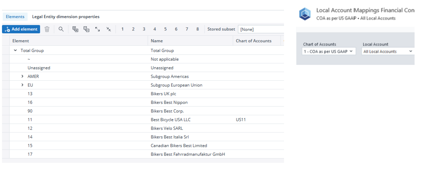 Configure Chart of Accounts: Mappings are defined per Chart of Accounts. Using the Chart of Accounts attribute in the Legal Entity dimension, you can specify which chart of accounts applies to each legal entity.