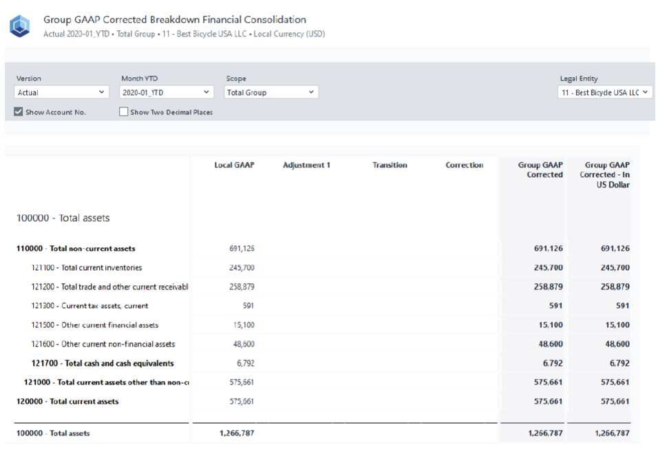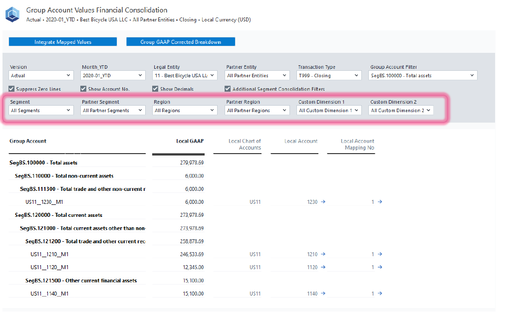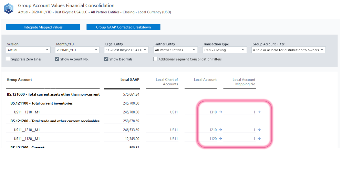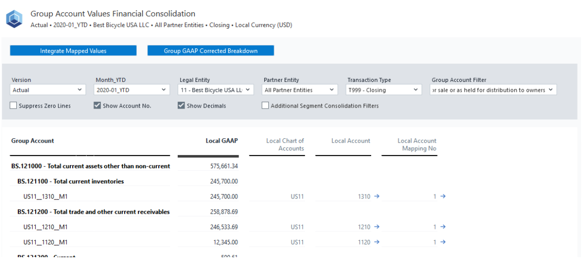 Drill Down to Local Accounts: If a group account shows a value, you can drill down to view the underlying local accounts that contribute to it. This provides transparency into how local accounts roll up into consolidated figures.