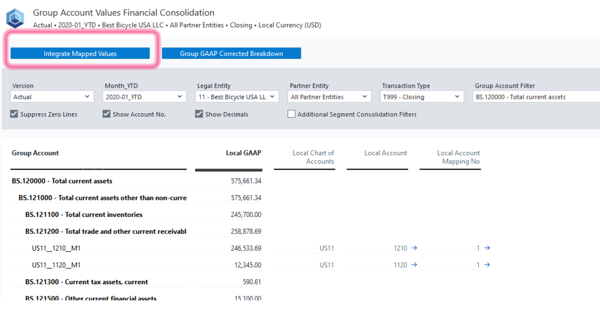Integrate Mapped Values: This action transfers the accurately mapped values from the Staging Area to their designated destination groups, such as the Balance Sheet or Profit and Loss statement. These values are then moved to the local GAAP, preparing them for the next stage of the consolidation process.