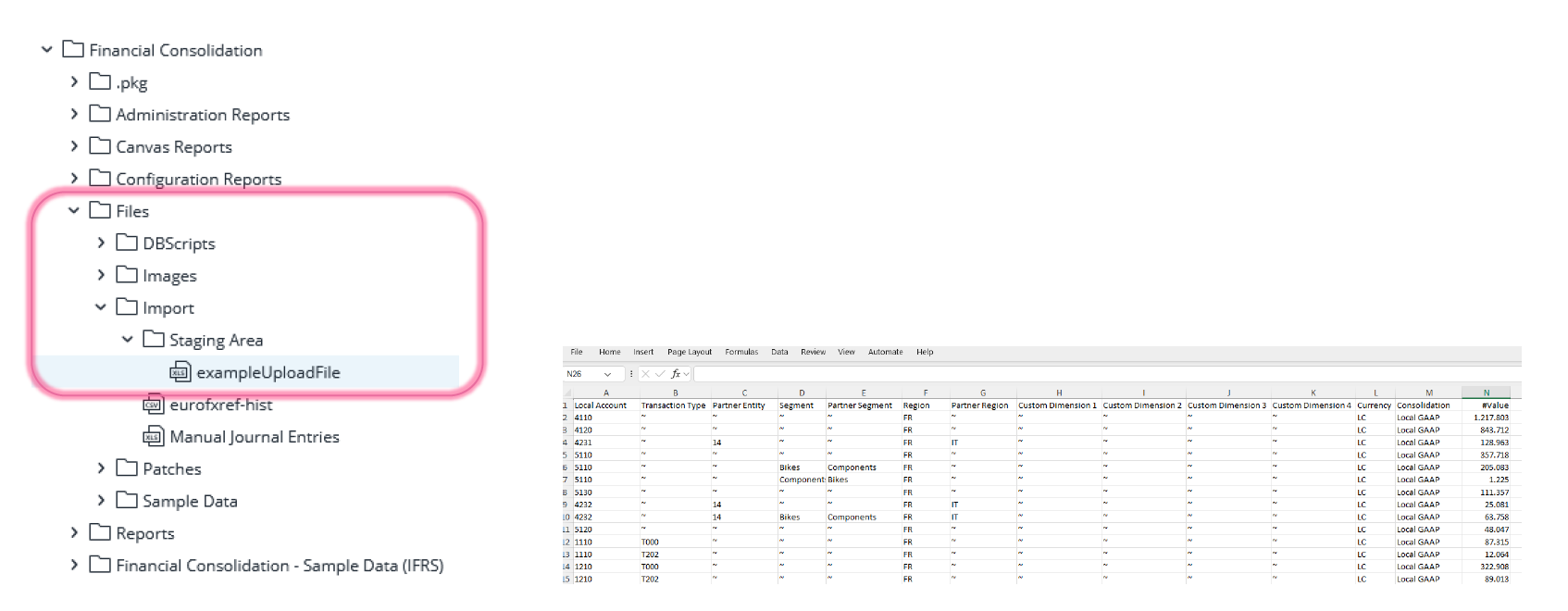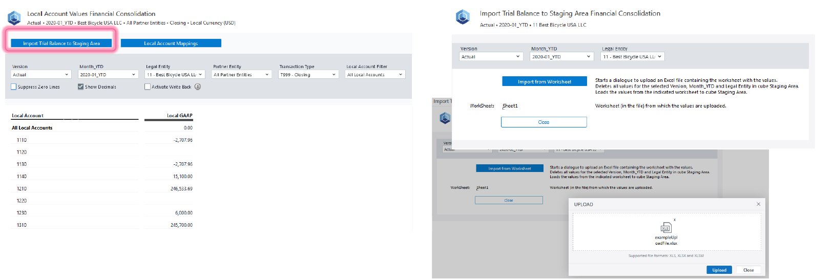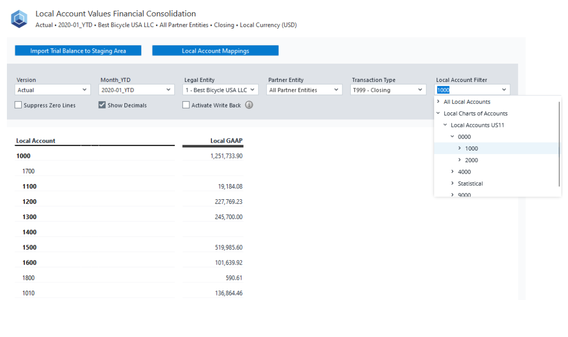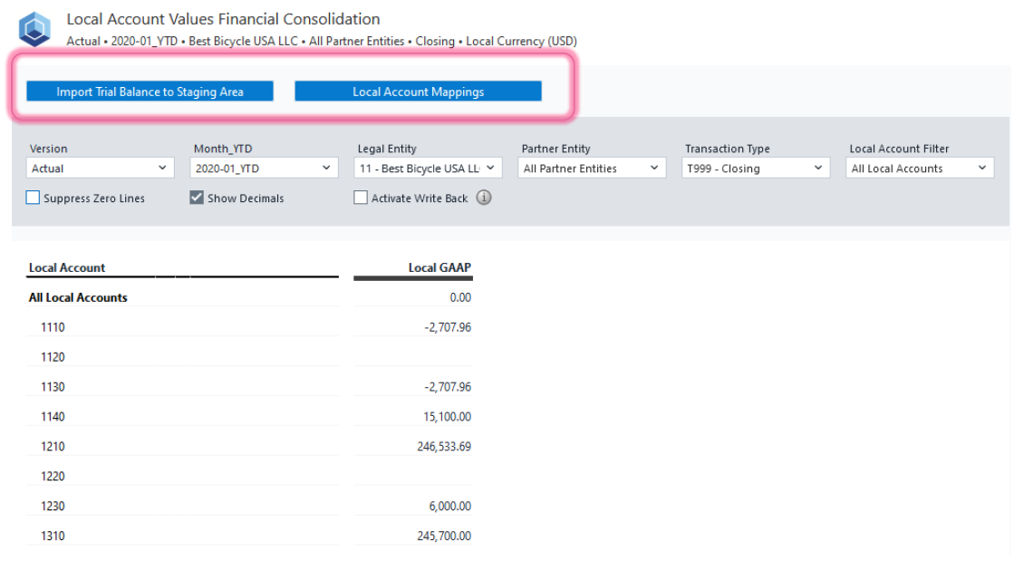 Local Account Values: In this report, you can review existing mappings in Local Account Mappings. Furthermore, you can use the Import Trial Balance to Staging Area to upload trial balance data from Excel.