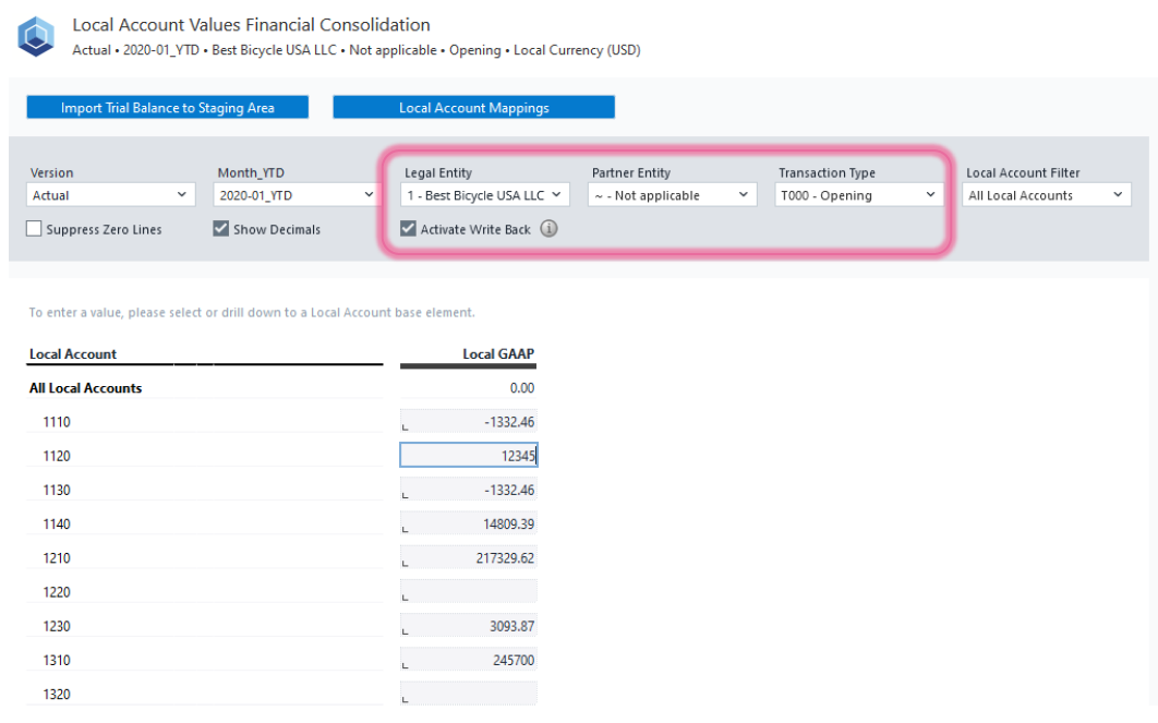 Activate Write Back on Local Account Values: The Write Back feature allows you to record or update data back into the database. To use it, make sure the Legal Entity, Partner Entity, and Transaction Type are all at the base level, then select 'Activate Write Back.'