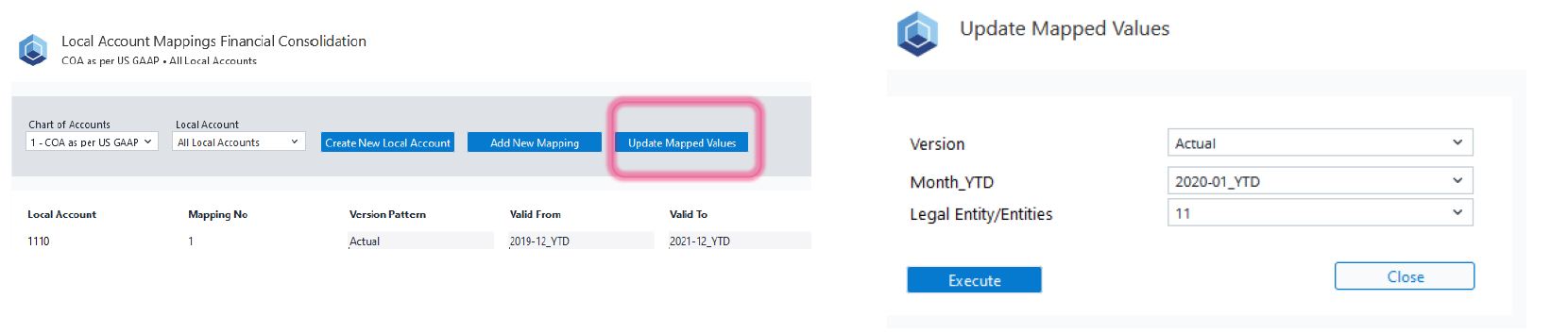 Update Mapped Values: Update these values to modify the Group Account dimension according to the assigned mappings. This is a crucial step for viewing financial information at a consolidated level. Furthermore, by updating the mapped values, you’ll transfer the local account balances to their corresponding group account levels in the Staging Area. Note that skipping this step will prevent consolidated data from appearing in subsequent reports.