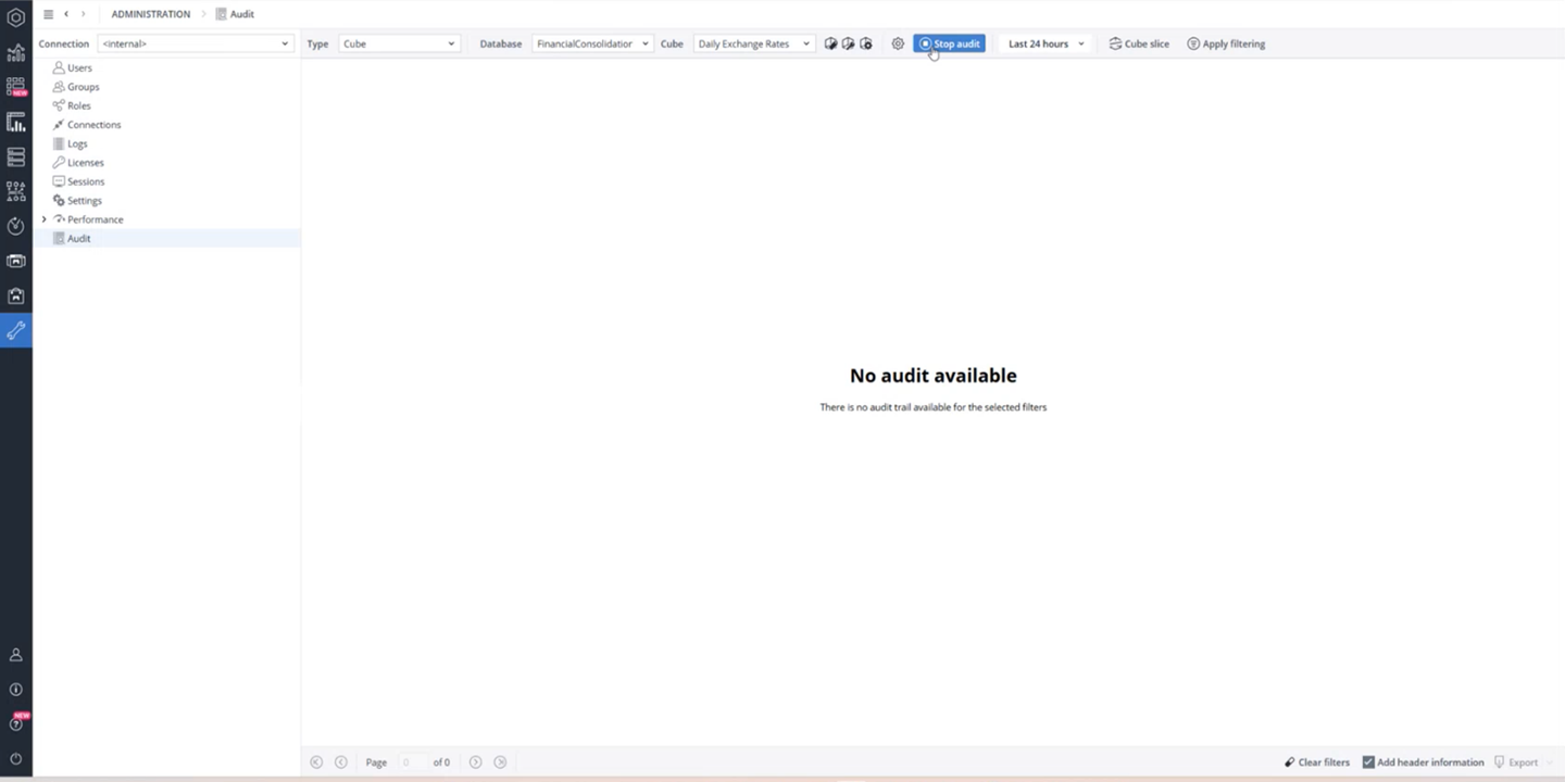 The Audit Manager allows administrators to start and stop auditing for multiple cubes, filter the audit log by cube, time, or dimension slices, and review changes in a structured way. This provides full transparency and supports internal controls, external audits, and compliance requirements.