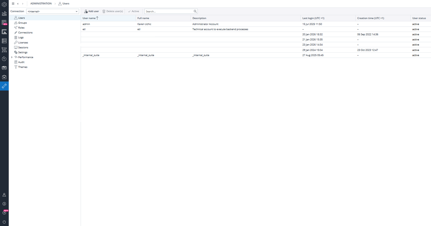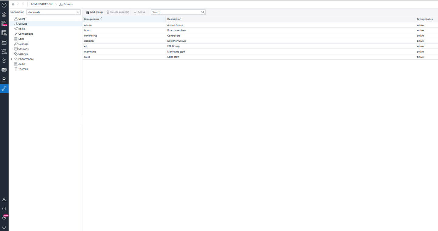 Users are created in Jedox by administrators in the User Management section of the Administration. Each user is assigned a name, description, and one or more groups. Groups represent business or technical roles, such as local legal entity controllers, consolidation managers, ETL operators, application designers, or reporting users. Additional groups can be created to reflect the organization’s structure or governance model.