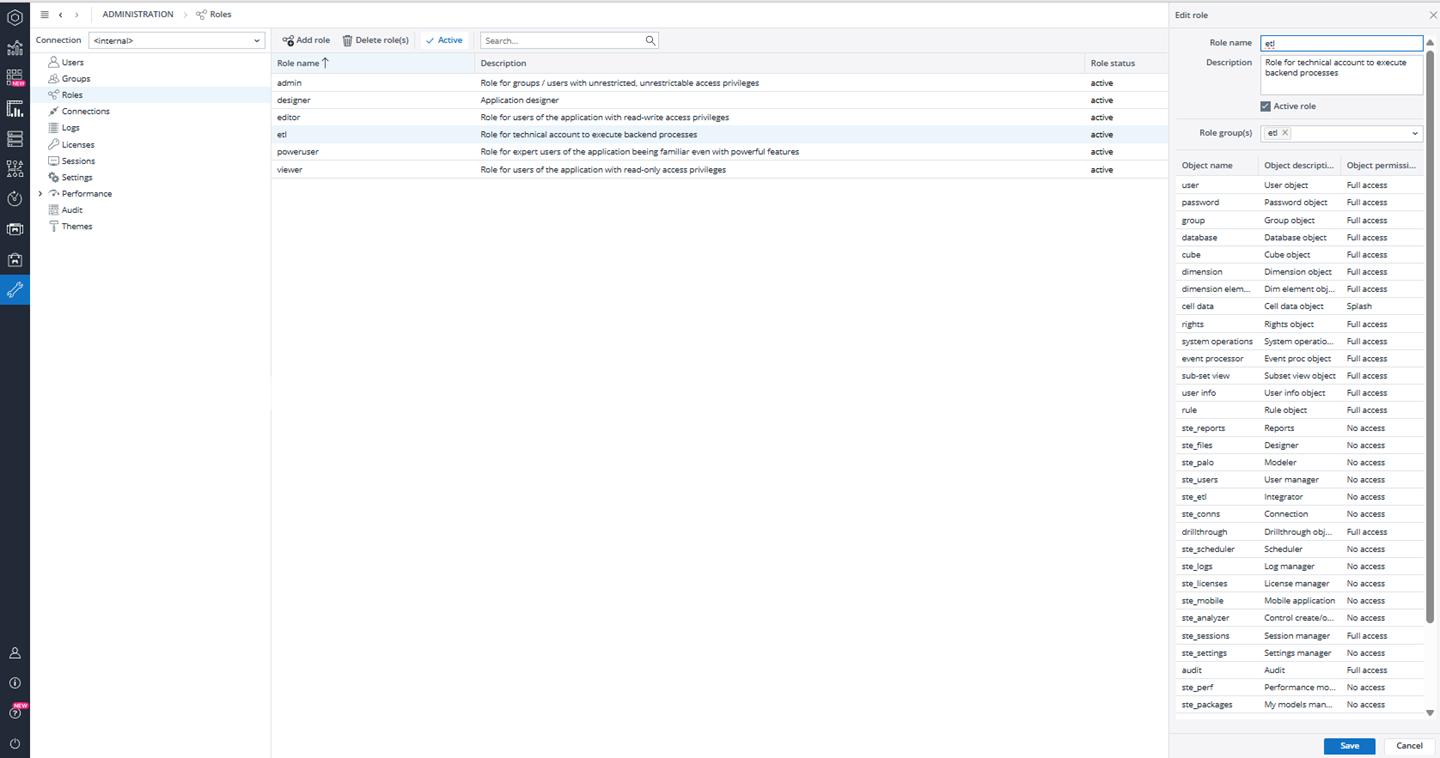 Roles control what each group can do inside the Jedox database. At this level, permissions can be defined for cubes, dimensions, cell data, and other model objects. For example, a designer role may have full access to all objects, including write and structural changes, while a controller role may only have permission to enter and adjust data but not modify the model itself.